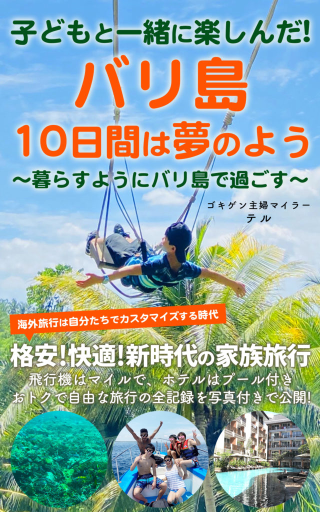 【バリ島新刊】バリ島10日間は夢のよう~暮らすようにバリ島で過ごす~格安!快適!新時代の家族旅行ついに新刊を出版することができました。 タイトルは、ズバリ!! 「バリ島10日間は夢のよう~暮らすようにバリ島で過ごす~格安!快適!新時代の家族旅行」 です。 おかげさまでAmazon新着ランキング1位になりました!!