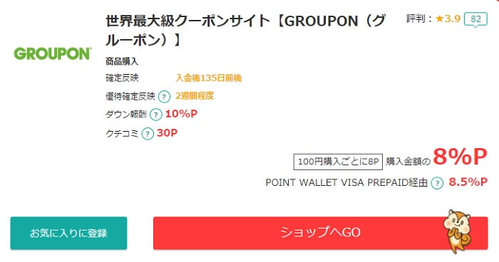 このポイントサイトを経由することで、まずはグルーポンで購入した商品の8%の金額分のポイントをもらうことができます。