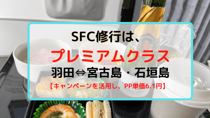 フツーの主婦である私がこんどはSFC修行というものに挑戦してみました。飛行ルートは憧れの離島である宮古島・石垣島です。宮古島や石垣島は距離も遠いですのでSFC修行にはぴったり。 長時間の搭乗でも疲れないように、1回の搭乗でプレミアムポイントが貯まりやすいようにまた飛行機の搭乗時間を最大に楽しめるように座席も普通クラスではなくプレミアムクラスでの予約としました。 キャンペーンを活用したのでPP単価も6.1円でした。 -
