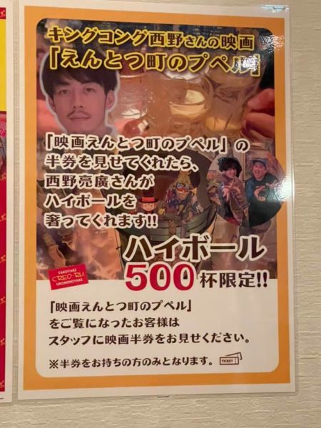 たまたま入ったお店には、こんな案内が!キングコング西野さんの「えんとつ町のプぺル」の映画半券を見せてくれたら、ハイボールをおごってもらえるそうです。