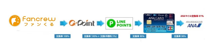 ファンくる→ Gポイント → LINEポイント →メトロポイント→ ANAマイル