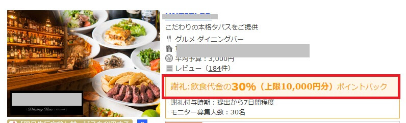 こちらは、飲食代金の30%の謝礼ポイントですが、