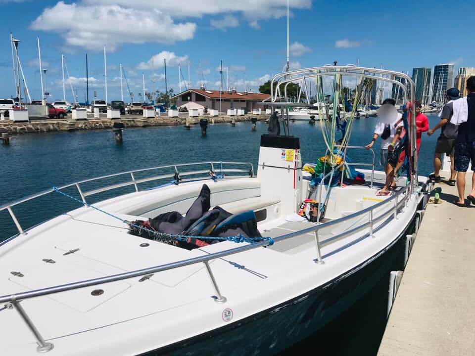 モーターボートで沖から離れ、いい地点までグングンと船で進みます。