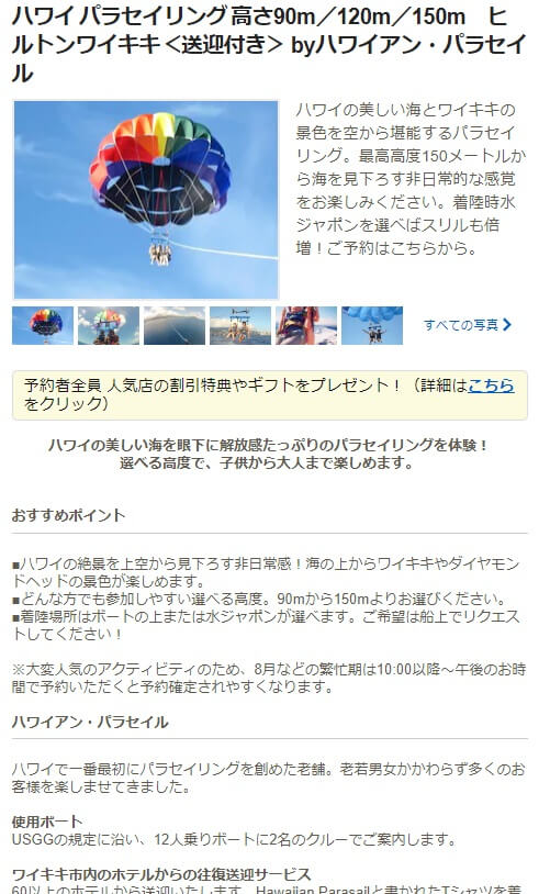 それではハワイでのアクティビティー、パラセイリングぜひ