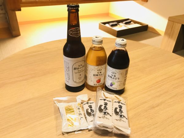 地場ビールにジュース、そして信州で有名なお菓子「雷鳥の里」です。(2,000円分ぐらいのサービス!)