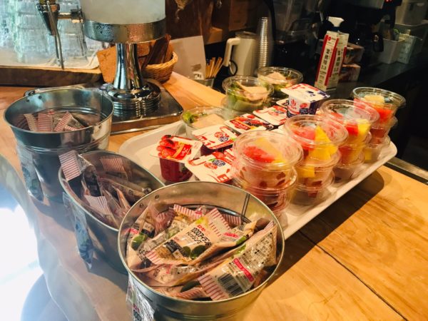 ロビーラウンジの奥にドリンクやお菓子が置かれていて、2,000円で自由に楽しむことができます。