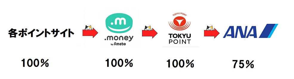TOKYUポイントへ交換後、ANAマイルへ移行する(交換率75%)