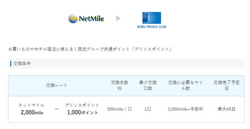 2,000ネットマイルが1,000プリンスポイントになるのですが、交換手数料として500ネットマイルが必要になりますので、2,500ネットマイルが1,000プリンスポイントになります。