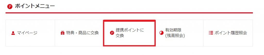 するとポイントメニューがー出てきて、「提携ポイントに交換」とあるので、そこをクリックします。するとこのような画面になります。
