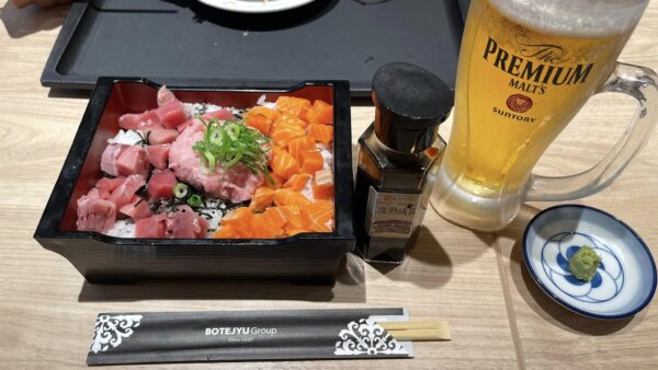 マグロとサーモン丼に生ビール!
