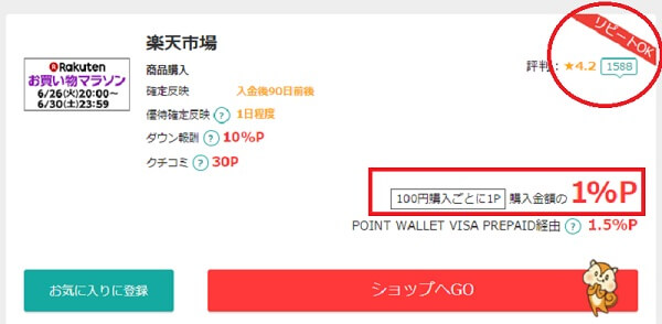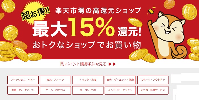 またモッピーでは、楽天市場内のお店によって15%~20%もの還元率もあるポイントがもらえることもあるので、