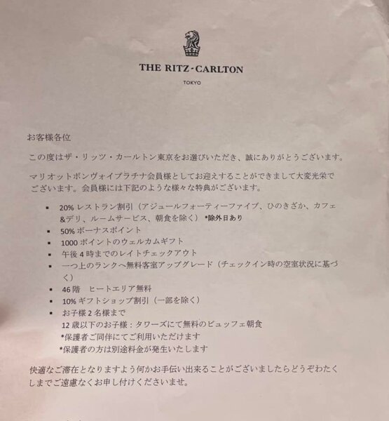 マリオット系列のホテルでは「リッツカールトン東京」に関わらず、