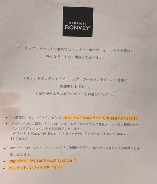 またマリオットボンヴォイエリート会員にはこのような特典もついていました。