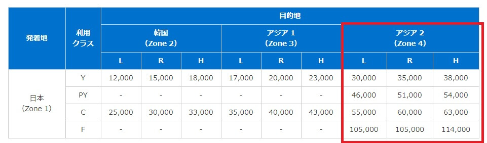 表ですと90,000円の部分が3万マイルで搭乗できます。