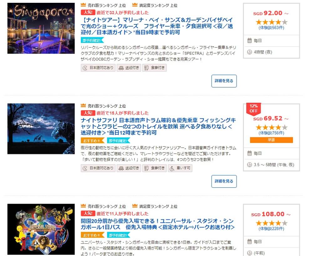 シンガポールのツアーは、こういったものがありますよ。100件以上のツアーがありますので、