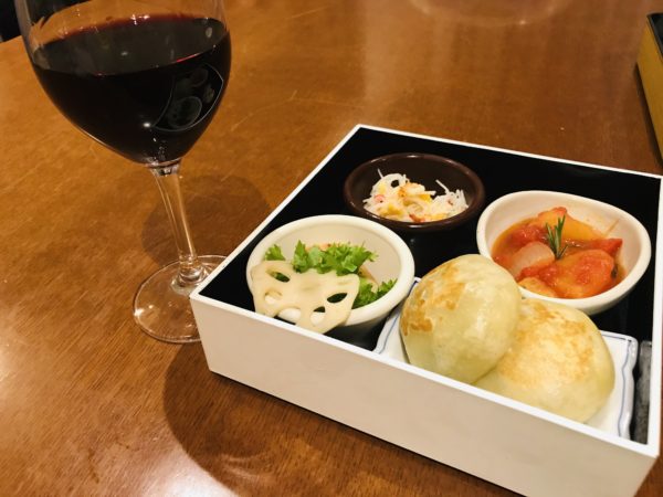 信州名物のおやきや山芋、れんこんの酢漬けなどのおつまみが一緒になったものがセットで配られます。