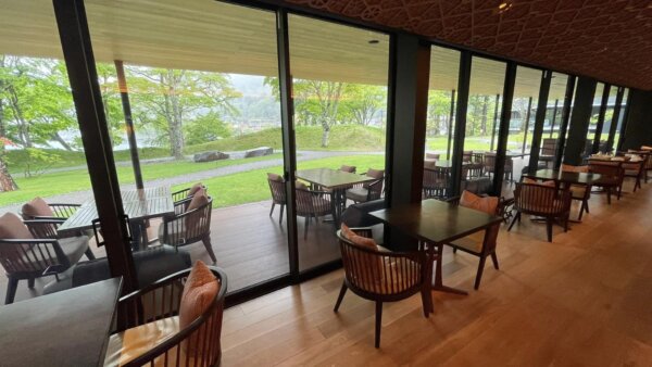 ロビーには、大きな窓が設けられ、自然の光が差し込む中、中禅寺湖の美しい景色を眺めることができます。