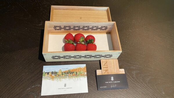 桐でできたケースにお菓子やいちごのサービスが用意されていました。