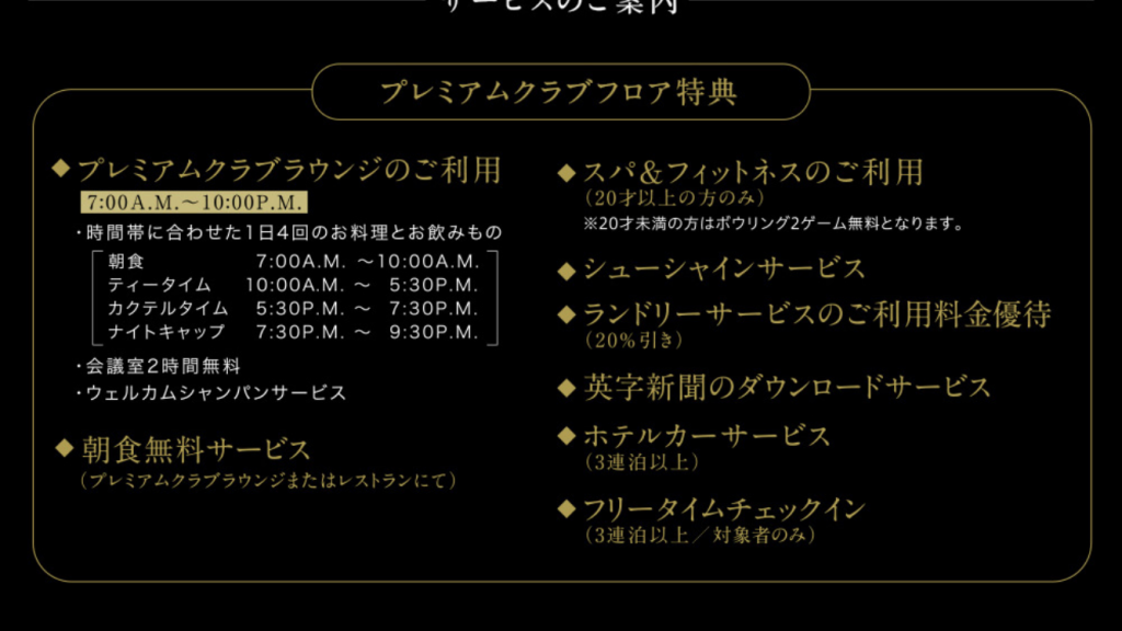 プレミアムキングルームのこのクラブラウンジ特典は、クラブフロアを使う以外にもいろいろとあります。