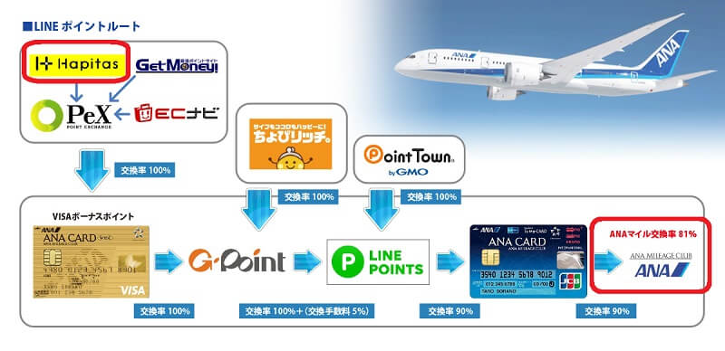 ハピタス(100%)→PeXポイント(100%)→ワールドプレゼントポイント(100%)→Gポイント(100%)→LINEポイント(100%)→メトロポイント(ソラチカ)(90%)→ANAマイル(81%)
