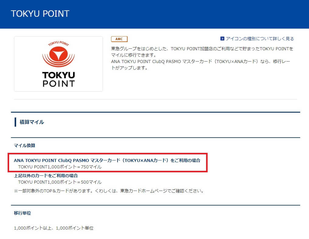 上記の画像を見てもらうとわかるのですが、TOKYU POINT1,000ポイントをANAマイルへ交換すると750マイルになります。